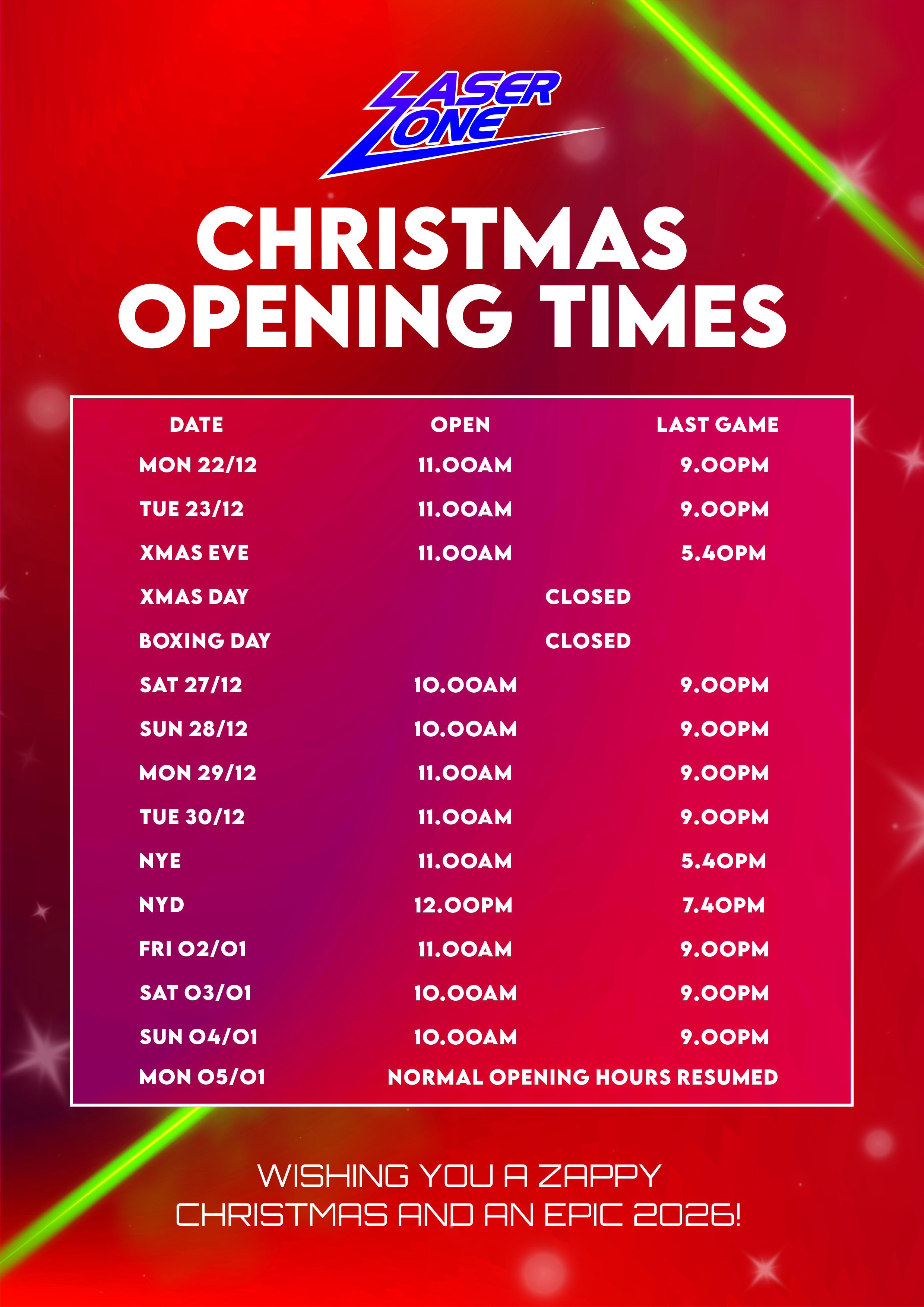During published school holidays and bank holidays, we open an hour early at 11.00AM from Monday to Friday. Weekend hours remain the same.